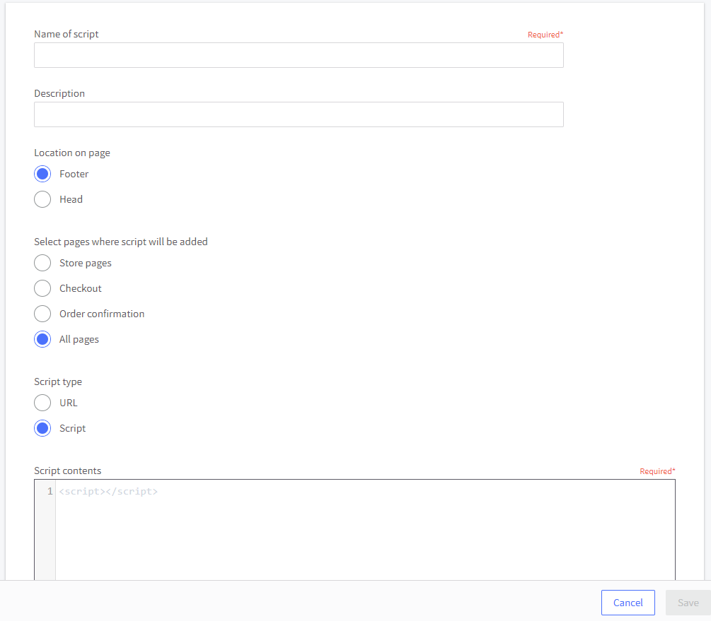 On the main navigation menu, select Storefront and then Script Manager. The Script Manager screen appears.