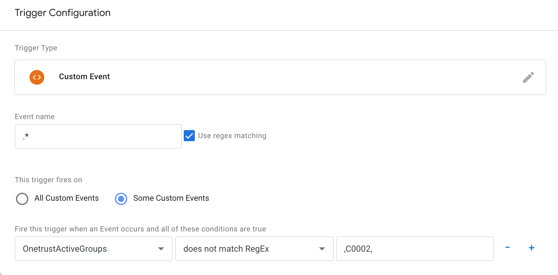 - Set the Event name to the event the on which affected tag will fire. This differs from the Data Layer variable OneTrustActiveGroups that must trigger on the event OneTrustGroupsUpdated.Select the relevant trigger and set it to fire when the following is true: